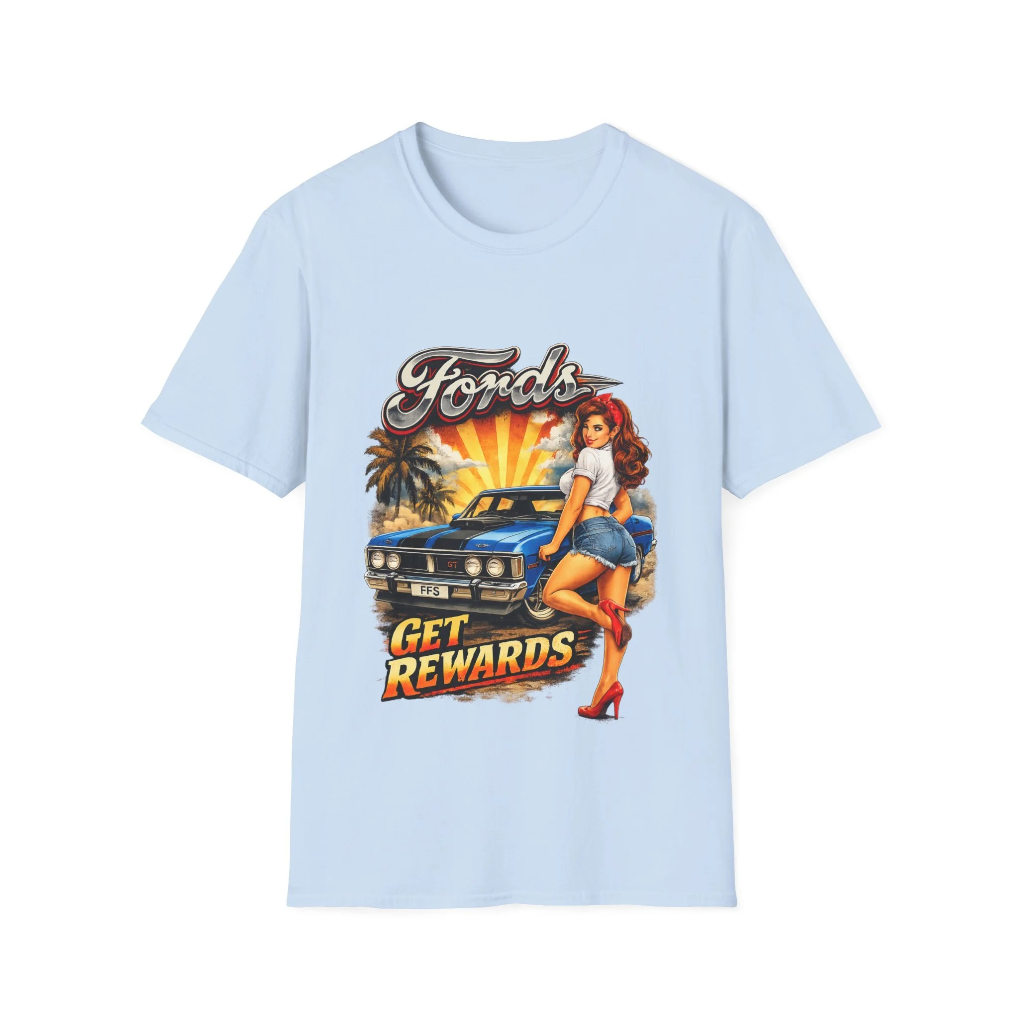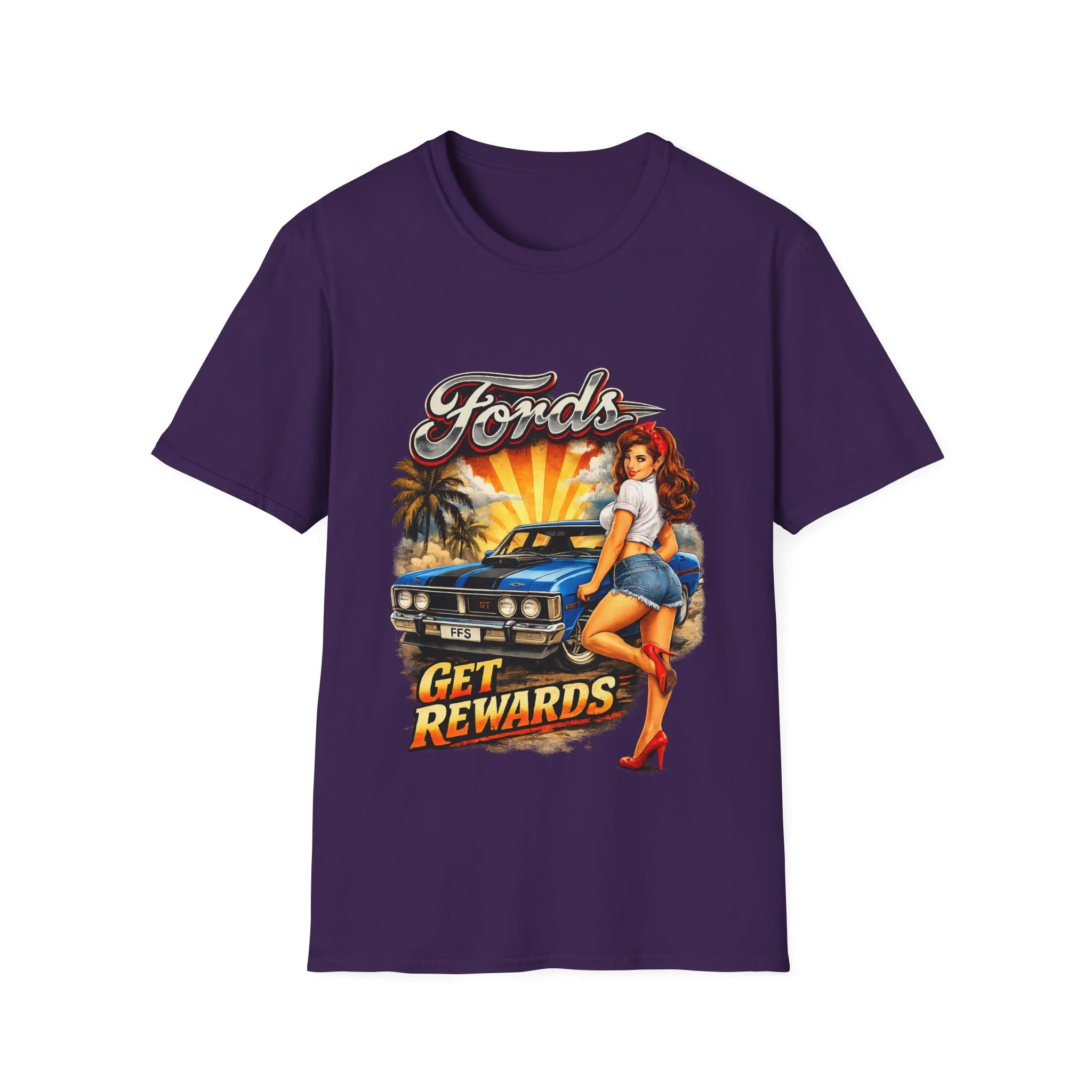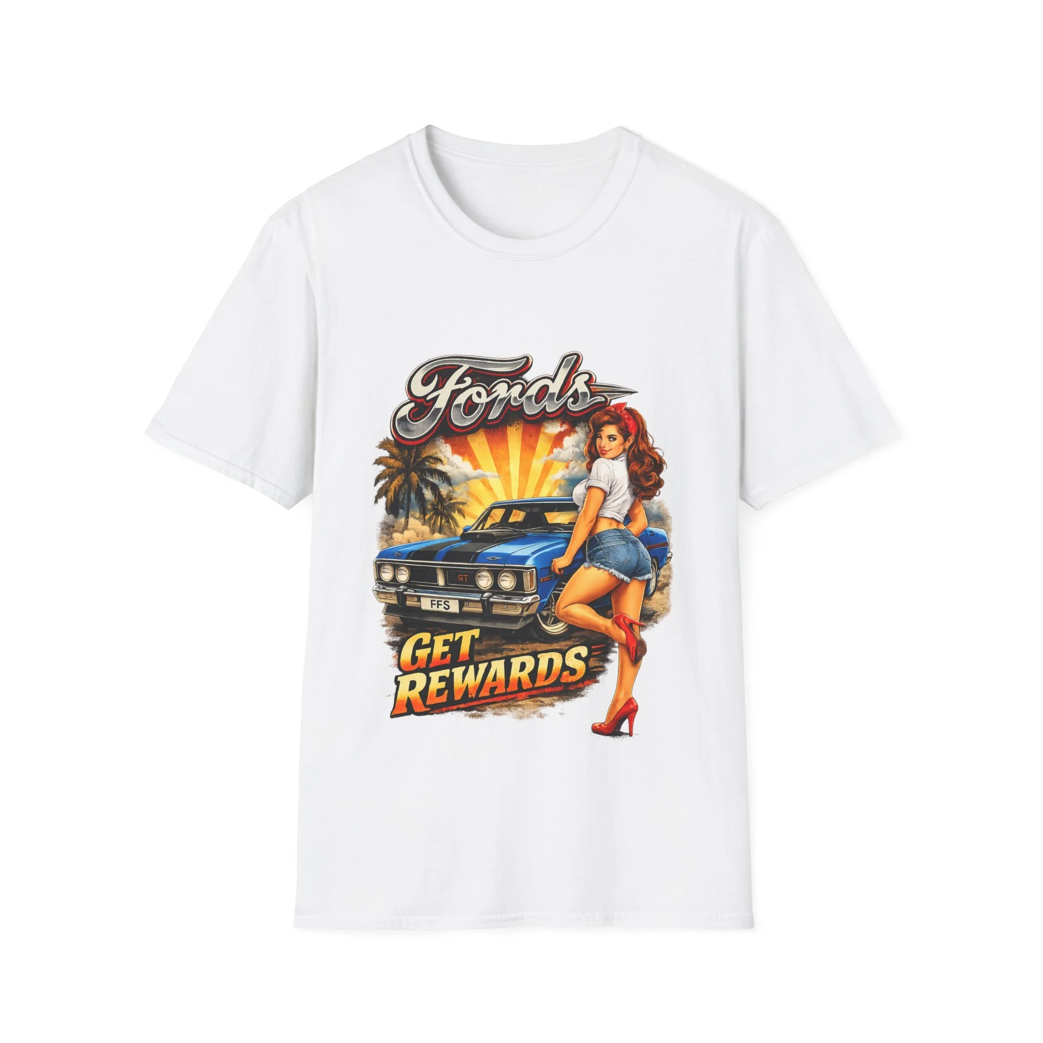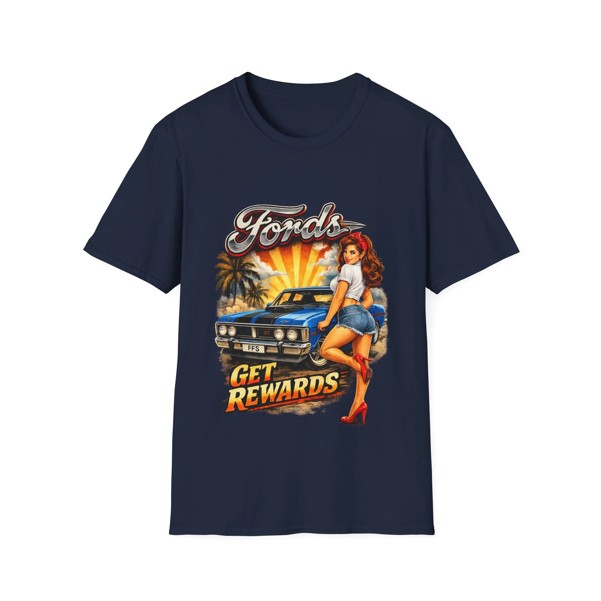 T-Shirt — Retro Pinup 'Fords Get Rewards' Classic Car Graphic Tee