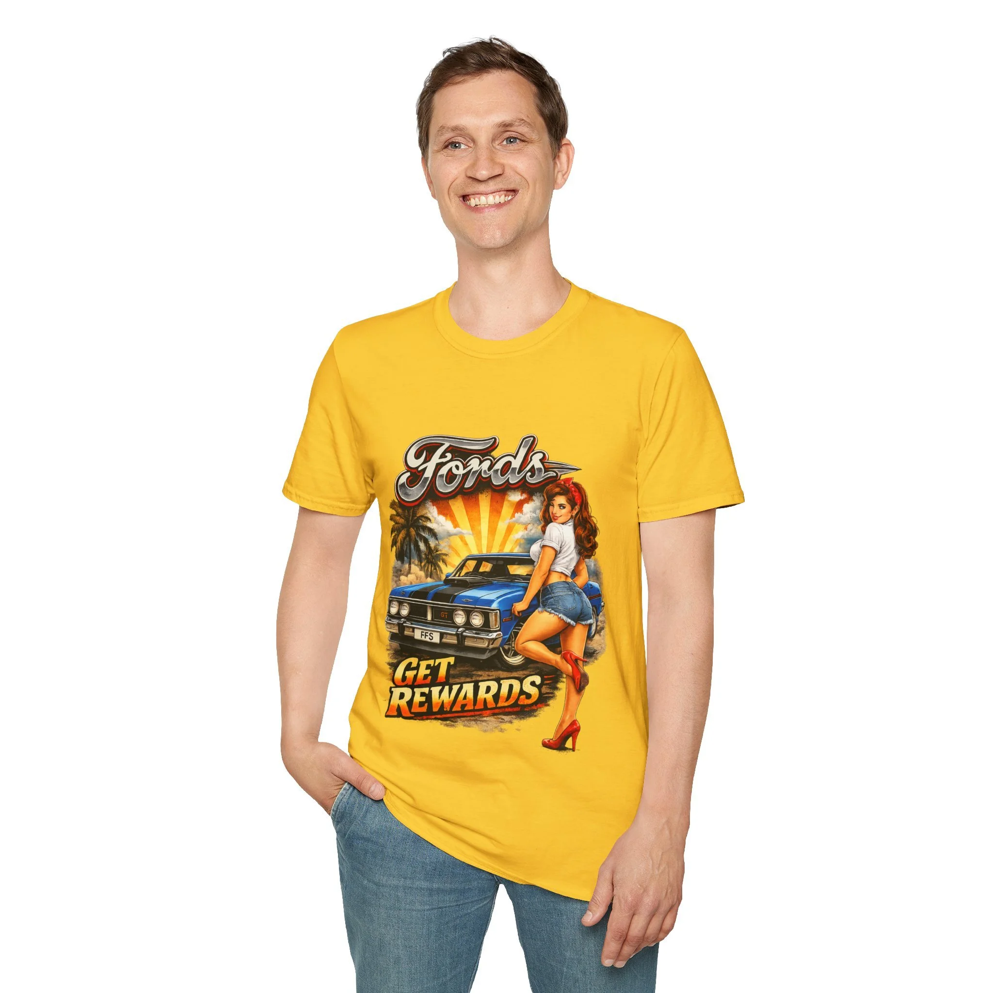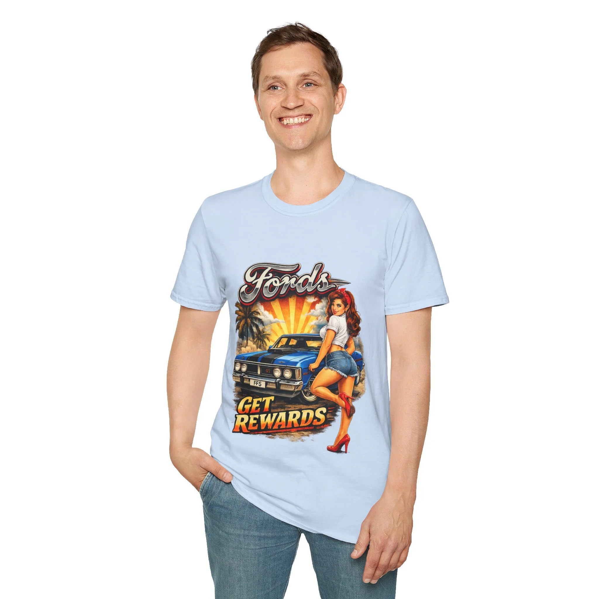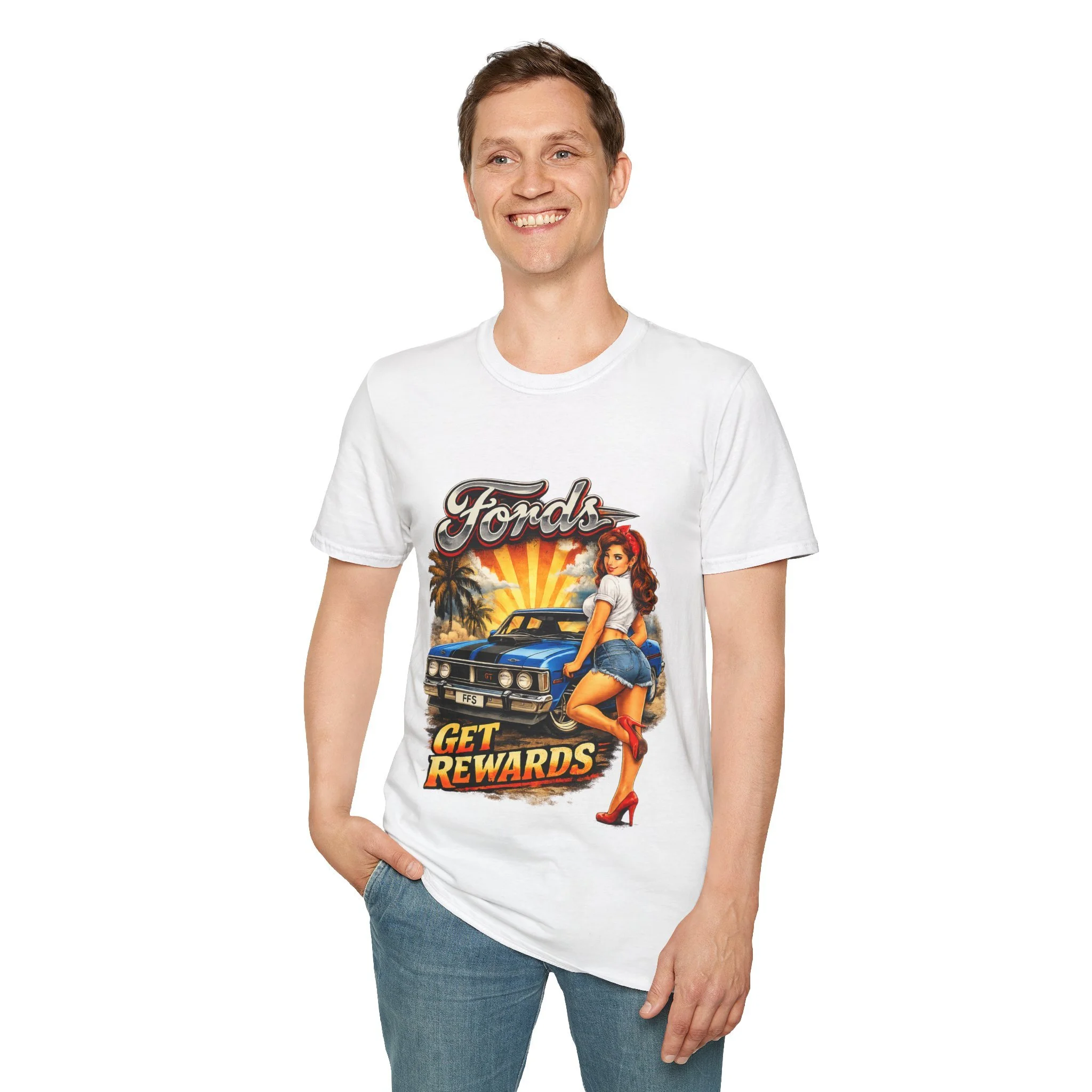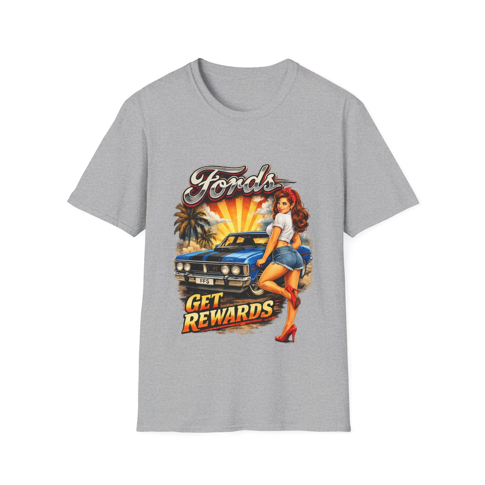 T-Shirt — Retro Pinup 'Fords Get Rewards' Classic Car Graphic Tee